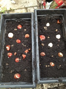 Large Flower Pots (bulbs need to be planted about 3-4 times as deep as the bulb is tall, so you’ll need a pot large enough for your largest bulbs) – I used troughs, but that’s just personal choice.